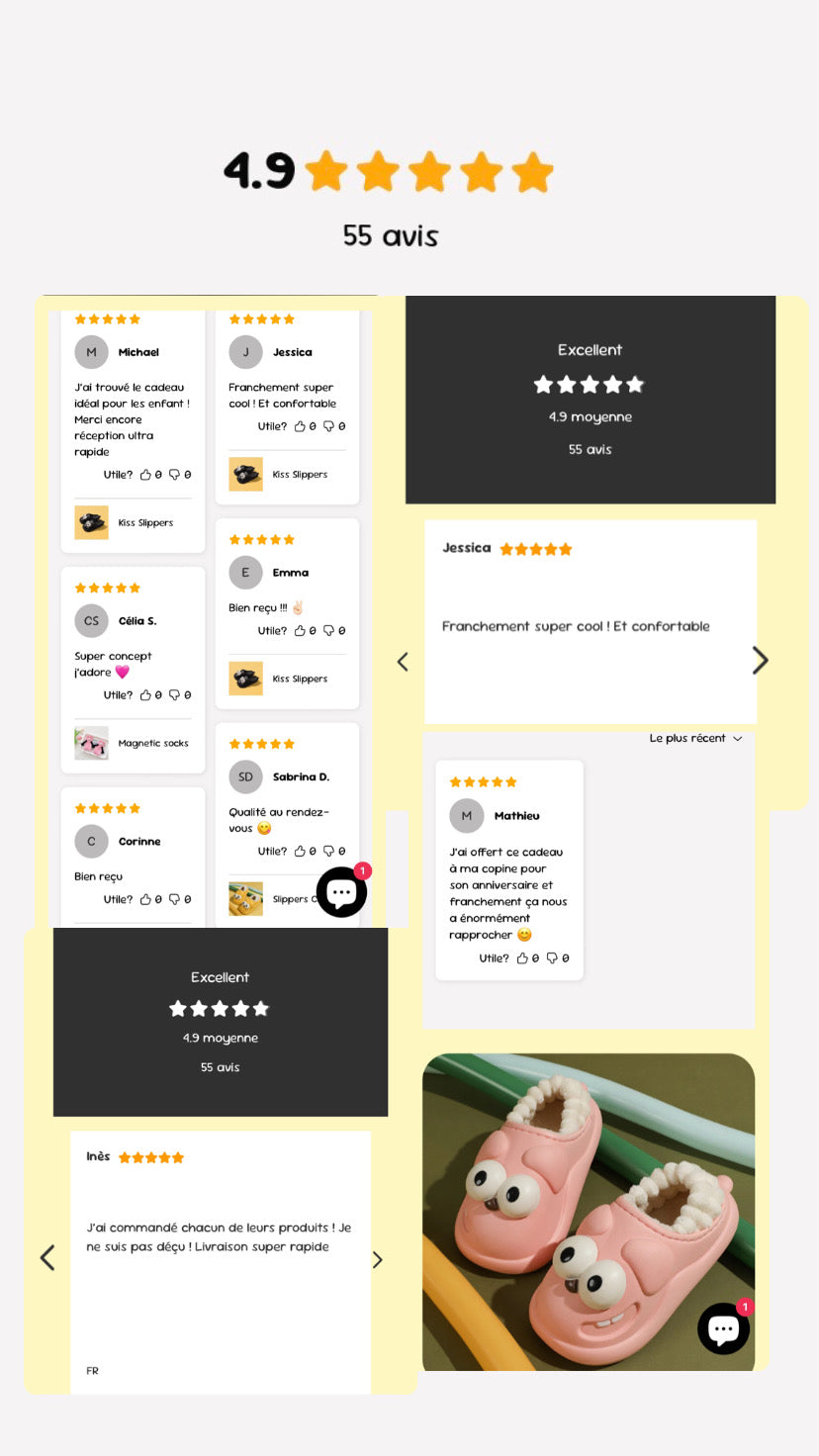 Contrairement aux copies que l’on voit sur Internet, nos pantoufles KissKicks sont fabriquées avec des matériaux premium, testés pour offrir une durabilité exceptionnelle et un confort inégalé.
